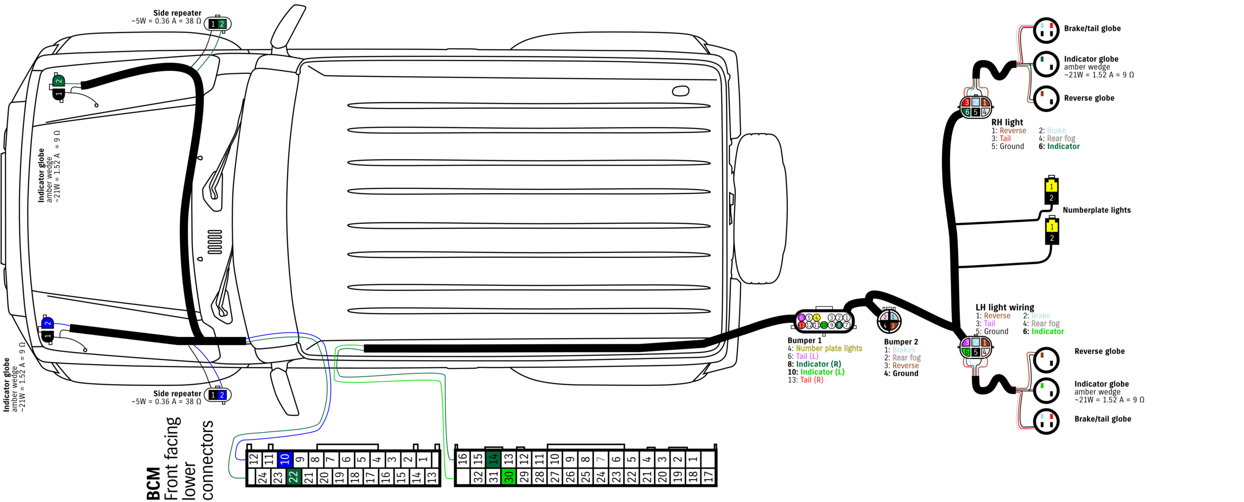 The front and rear indicators hook into different parts of the BCM: something I’m yet to fully determine is if they are internally linked together or separately monitored. This will become important when we work out how to emulate the load of the factory globes.