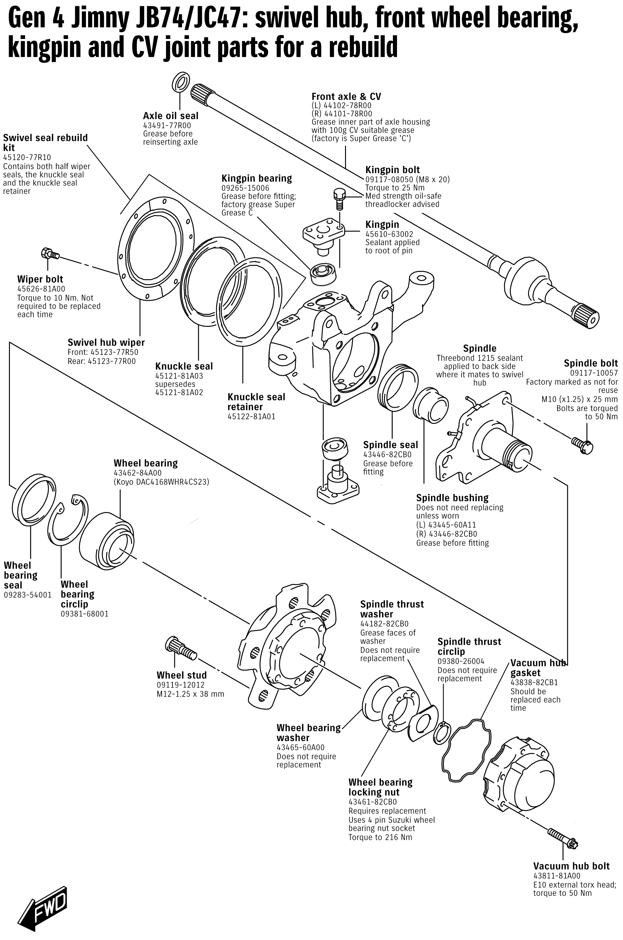 Needing to refresh your kingpins and kingpin bearings? Got a CV joint/front axle issue that needs solving? Here’s how you refresh your gen4 Jimny JB74’s swivel hubs. It would apply to a JC74 5 door as well, although some of the parts are different.