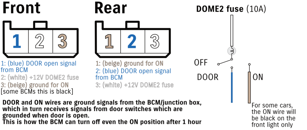 Note that both the blue and the beige wire eventually run back to the junction box/BCM. This is how the car can do some control things on the lights, like fading out the door light after a period of time from when you’ve got into it. It will also shut off the ON position for the light after a period of time. Note that the wire colours change for some cars for the front connector, and that the pinouts are different between front and rear.