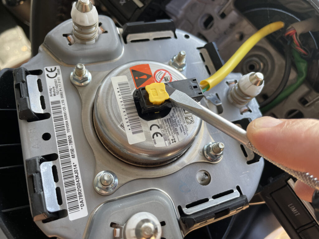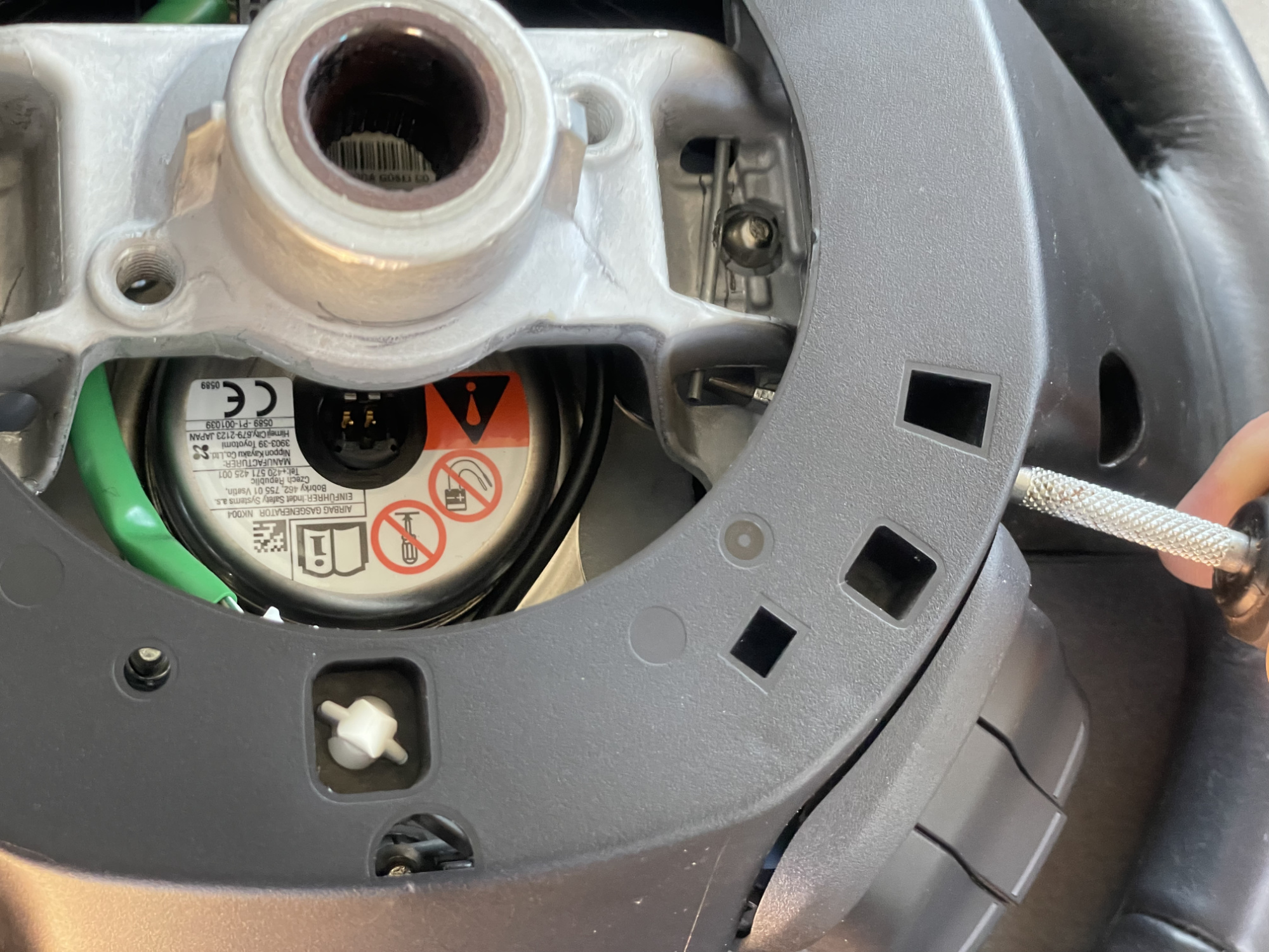 You do this to all 3 clips and then the airbag will be unseated but still mostly sitting in the steering wheel. If you struggle to find the clips, shine a bright torch into the steering wheel interior to allow you to see the wire clip to more easily work out the angle to push the screwdriver.