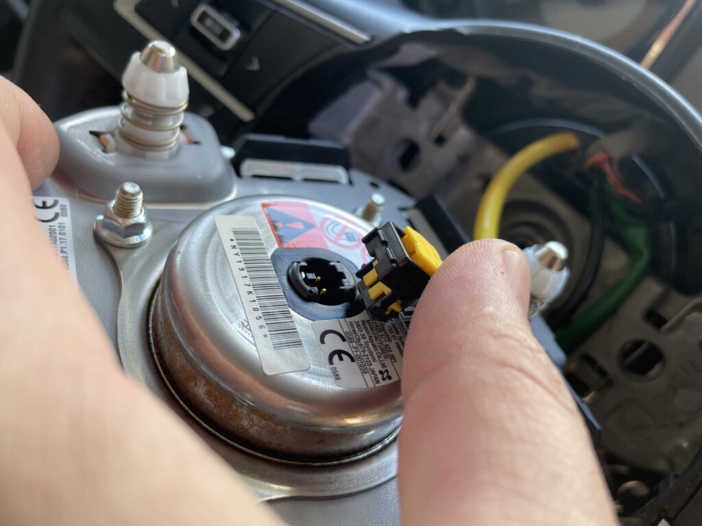 Make sure all of the wires are clipped into the clockspring, and then refit the wiring to the airbag. Place it onto the 3 pins and then just push it down and it’ll clip into place.