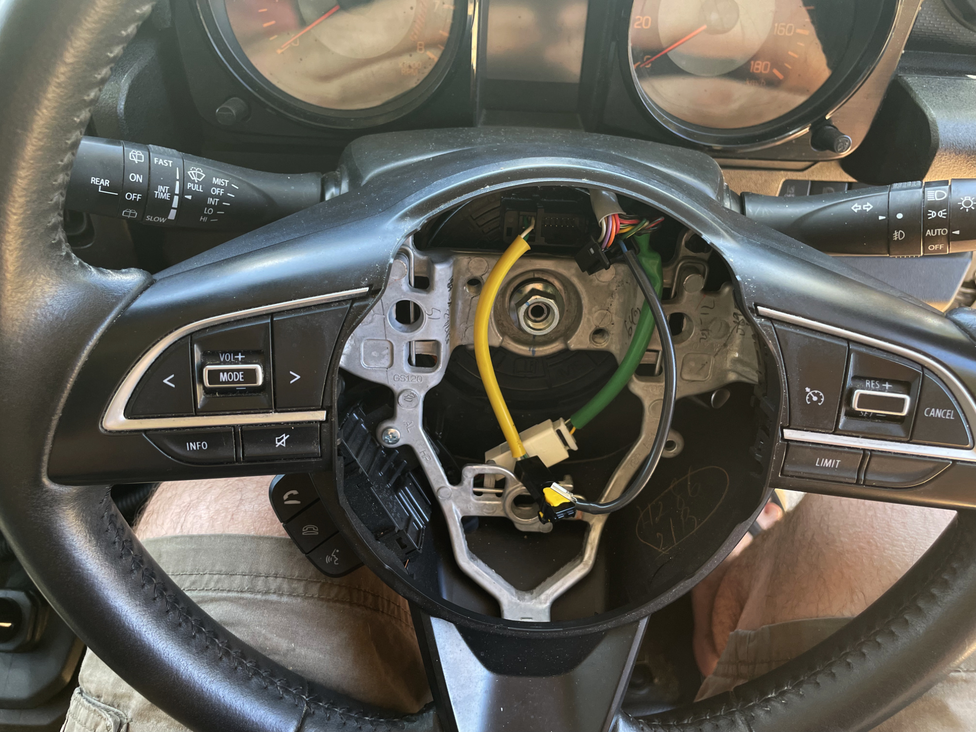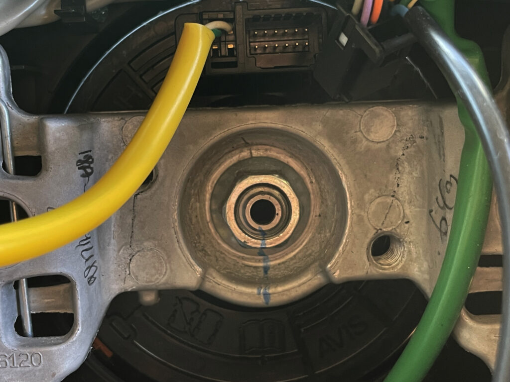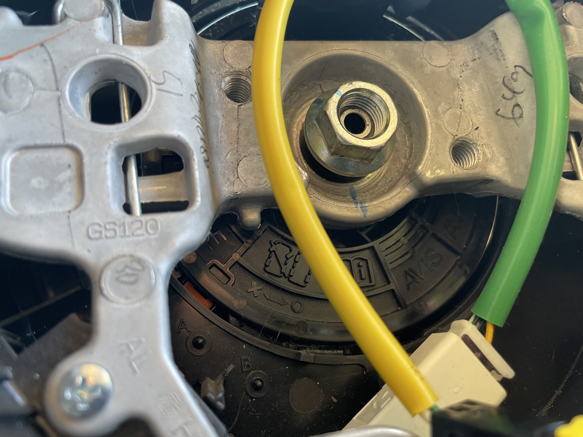 I took zero pics with the wheel fully off, but DO NOT turn the clockspring other than minor adjustements to line it all back up when you fit the new wheel. Have the wheel lined up in a nice position where you can re-align the new wheel to (e.g. match the back of the steering wheel to the cowl over the column) and slide it back on.