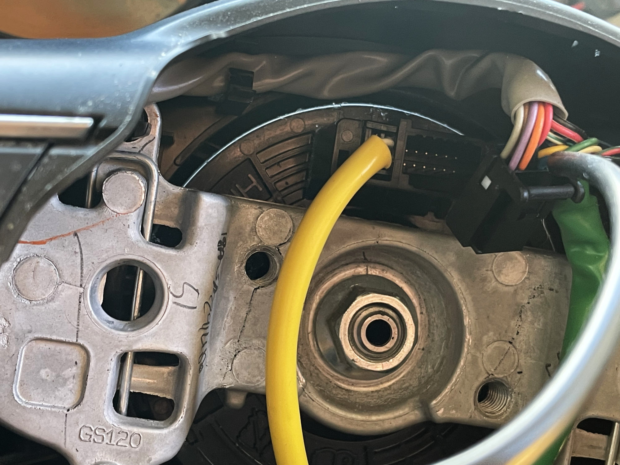 With the airbag removed from the wheel you can lift it up a bit and you’ll see two wires running to it: A bare black wire with an uninsulated spade connector on it, and, a yellow sheathed wire with a fancy looking plug on it. The former is the horn wire, the latter is the airbag deployment wire.