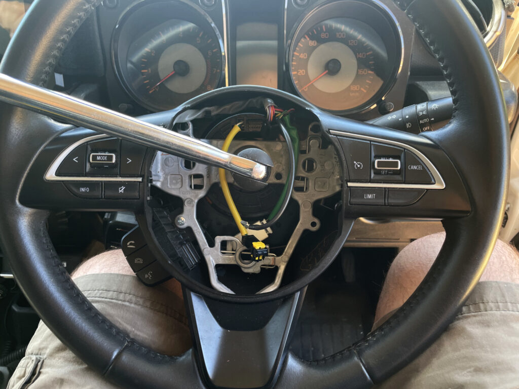 The Jimny has 3 access ports to get to the airbag retainer clips. One is each side of the steering wheel, and one is to the left of the lower spoke. These give you access to wire clips that you have to push with a flat-bladed screwdriver to release the airbag pins.