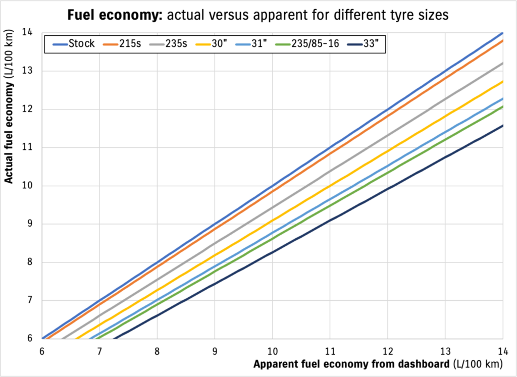 For smaller tyre size changes such as putting on a 215/75-15, any reduction in apparent economy is basically just down to the tyre characteristics, but once you get to larger sizes you do need to take into account the size corrections. For example, if your dashboard says 7.5L/100 km and you’re on 215s, you’re actually getting 7.4 L/100 km. However, if you’re running a 31″ tyre and the dash reports 8.5 L/100 km then you’re also getting 7.4 L/100km.